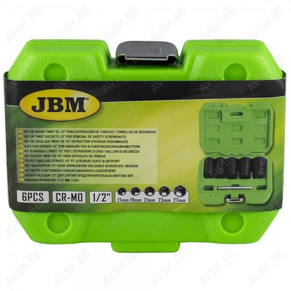 Lõikesoontega padrunite komplekt 1/2". millega saab avada vargamutreid ja vargapolte. Rattapoltidele ja mutritele läbimõõduga 17-19-21-23-27 mm. Spetsiaalsest kroommolübdeen terasest. Plastkohvris.