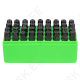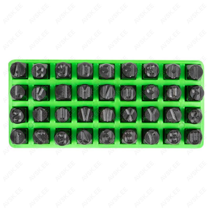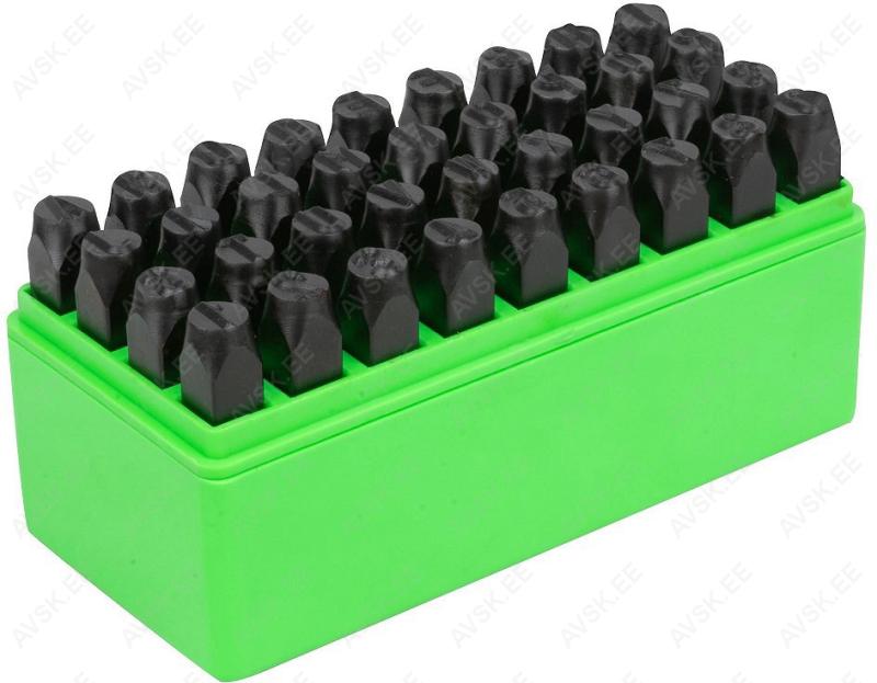 8 mm kõrgusega numbri- ja tähestantsid. Plastkarbis. 36 tk komplektis. Eriterasest.