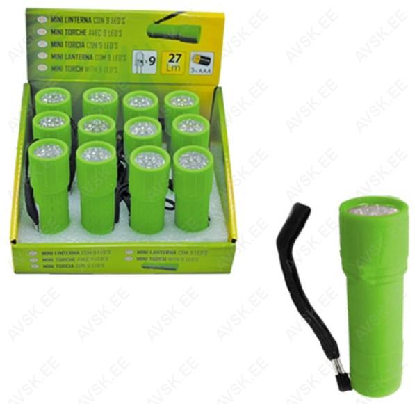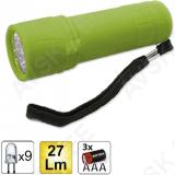 Kummikattega kompaktne taskulamp mis töötab 3xAAA patareidega (ei ole kaasas). 9-LED valguselement. 27 lm valgusjõud. Käepaelaga.