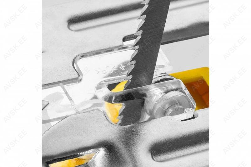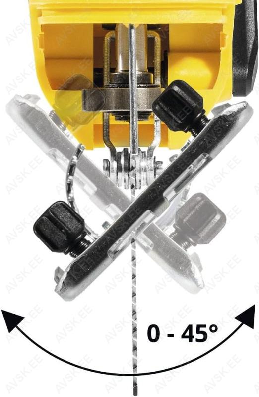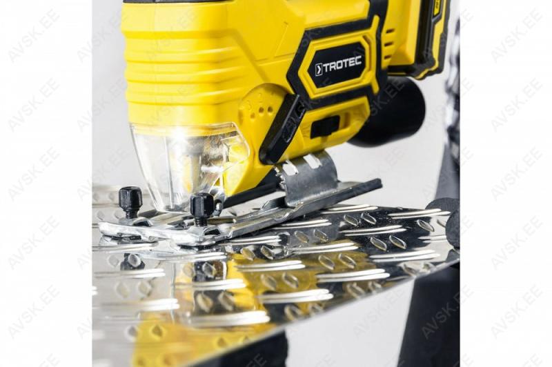 LED-valgus. Võtmevaba teravahetus. Väljavõtt imurile. Ergonoomiline pehmendustega käepide. Reguleeritav pendlifunktsioon. Puhumisfunktsioon puhta lõike saavutamiseks. Tugitalla nurka on võimalik muuta kuni 45 kraadi. Komplektis kohver. juhik. 3 tera. 2 Ah aku ja laadija.