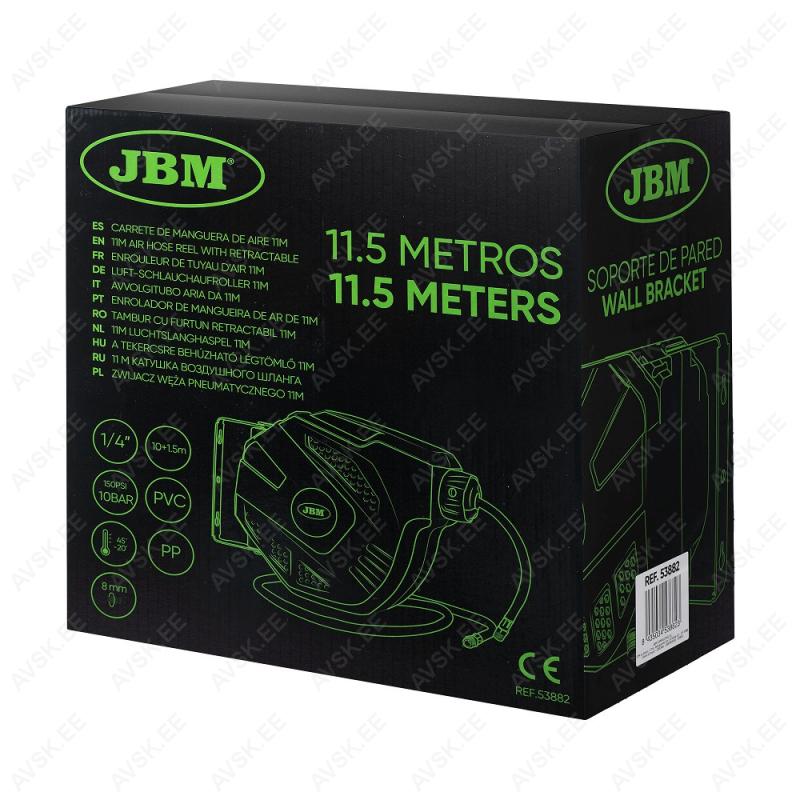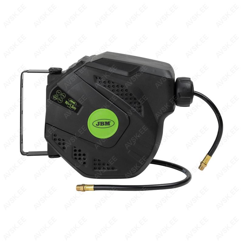 Murdumiskindlast hübriidpolümeer-materjalist voolik. löögikindel plastkorpus. 180º pöörduv seinakinnitus. Automaatselt liikuv juhik tagab vooliku korrektselt külg-külje kõrval paiknemise tagasikerimise korral. Vooliku sisediameeter 8 mm (välis 12 mm). pikkus 10 m + 1.5 m ühendusvoolikut. 1/4" otsakinnitused. Max 10 bar või 150 psi. Kaal 4.5 kg.
