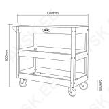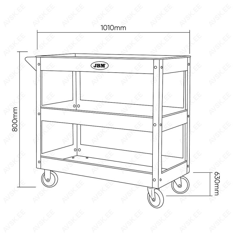 Klassikaline XL suuruses terasest kolme tasapinnaga käru. Kandejõud 100 kg. Plastkattega rattad. millest 2 tk pööravad. Rattad ja tasapinnad poltkinnitusega. Tirimiskäepidemega. Õli- ja keemiakindel värvkate. Tasapindade omavaheline kaugus 190 mm. Kogukõrgus 800 mm. laius 1010 mm. sügavus 630 mm. Kaal 24.7 kg.