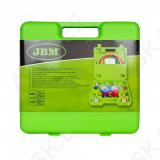 Kliimasüsteemi kellade komplekt. mida kasutatakse süsteemi hoolduse-. diagnostika- ja remonttöödel. Sisaldab kellad (kõrge-madal). kraanid (kõrge-madal). liidesed (kõrge-madal). lisaks voolik pikkusega 1550 mm. Kellad asuvad alumiiniumist kaitsekorpuse sees. korpusel metallist riputuskonks. 0-35 bar. Sobib gaasile R135a. R12. Plastkohvris.
