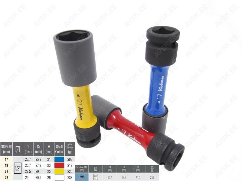 Ko-ken veljepadrunite komplekt sisaldab viit pikka eriti õhukese seinaga padrunit – 17mm. 19mm. 21mm. 22mm ja MB-veljepoltide 17mm eriprofiiliga padrunit. Kõik padrunid on erinevat värvi. mis teeb õige mõõdu leidmise kiireks ja lihtsaks. Eemaldatav plastikaitse padrunil hoiab ära velje kahjustamise mutrite/poltide keeramisel. Plastikkaitse on ka padruni põhjas. mis kaitseb mutri-/poldi pead vigastuste eest. Iga padruni varrele on prinditud padruni mõõt. Padruni õhuke sein ja 110 mm pikkus tagab ligipääsu poltidele/mutritele ka sügavama ja kitsama poldiava korral.