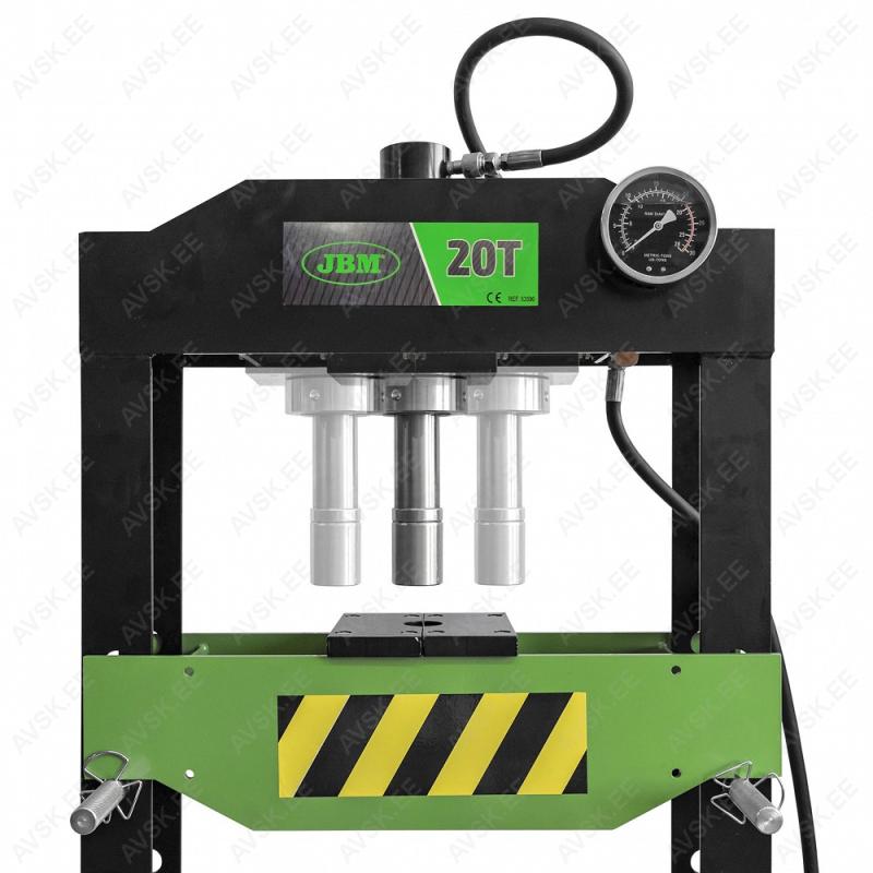 Suurepärase hinna-kvaliteedi suhtega 20 t survejõuga hüdropress. Käsipumbaga. Surukolb on liigutatav vasakule-paremale. Töötasapinna (pressimisalus) kõrgus on reguleeritav. Töörõhu manomeetriga. Raam polditud ja keevisliidetega. Korralik keemia-. määrde- ja õlikindel värvkate. Surukolvi töökäik 145 mm. Tööulatus (koos tasapinna liigutamise võimalusega) 58-1018 mm. Töötasapinna laius 540 mm. Surukolvi liikumisulatus 180+180 mm. Valmistatud JBM tehastes Hiinas. Kaal ca 115 kg.