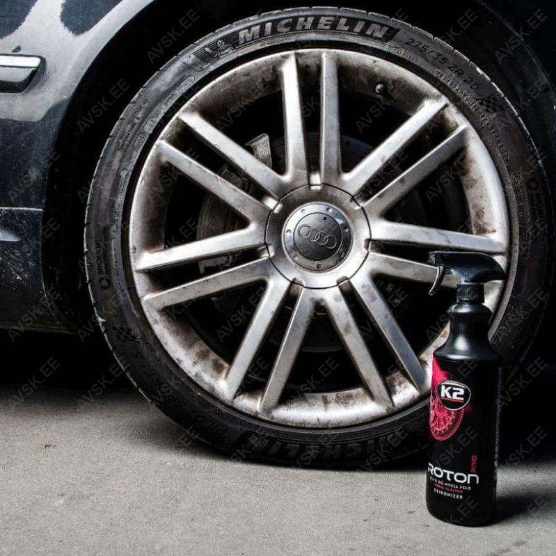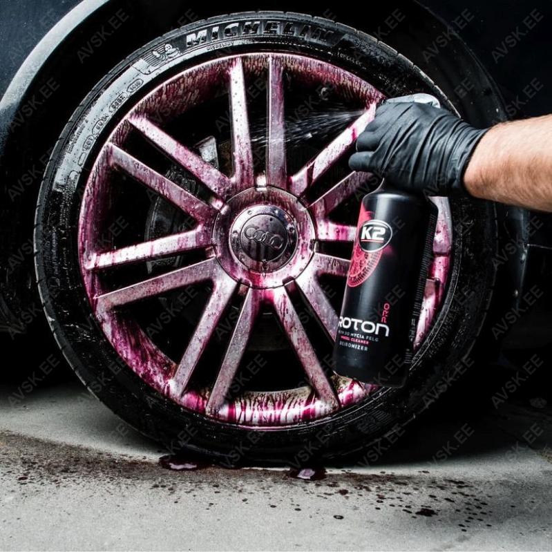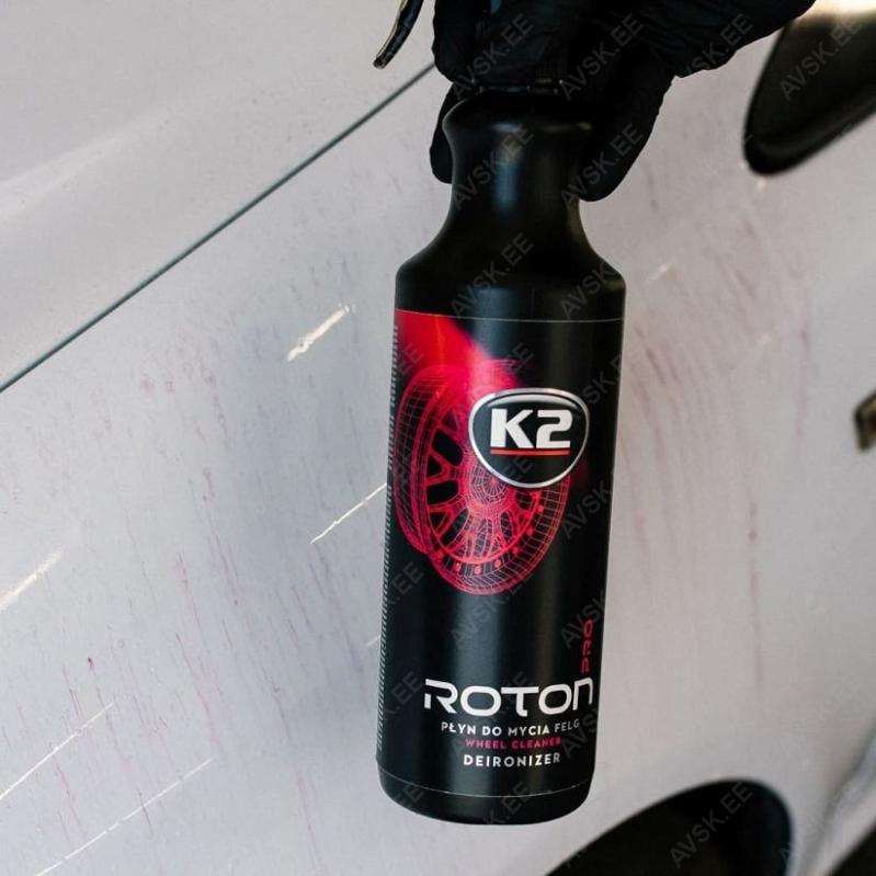 K2 ROTON PRO on ainulaadse koostisega geeljas veljepesuaine. mis on tänu oma erakordselt tõhusatele puhastusomadustele omandanud legendi staatuse ja saanud esimeseks valikuks neile. kes eales on määrdunud velgede puhastamisega silmitsi seisnud. See tuleb kergesti toime teemustuse või piduriklotside tolmuga. pakkudes silmailu suurejoonelise vaatemänguga. Veljepuhastusvahend muutub mustusega kokkupuutel punaseks. tõestades selle tõhusust ja võimaldades teil puhastusprotsessi kontrollida. Tõhus. kuid samas ohutu lakile. kummile ja plastikule. Sellel on neutraalne pH. Seda saab kasutada ka deironisaatorina metalliosakeste eemaldamiseks värvitud pindadelt. Tugevalt määrdunud pindade puhul soovitame kasutada K2 ROTON PRO veljepesuainet koos K2 SCEPTER PRO veljepesuharjaga.