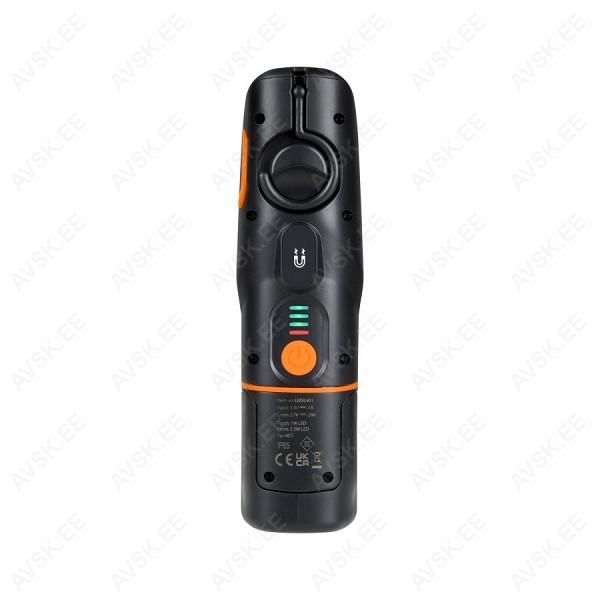 Tugev ja vastupidav töölamp. mis sobib professionaalseks ja kodukasutamiseks. Kolm valgustuse astet. külgvalgusti kuni 250 lm. Tänu otsvalgustile kasutatav ka taskulambina. Otsvalgusti võimsus 70 lm. Laetav. laadimise aeg kuni 3 h. Laadimise ava USB-C. Niiskuskindlus IP65 tagab murevaba kasutamise õues. niisketes tingimustes jne. Jalaosas tugev magnet. jalg 180° pööratav. Kaal vaid 215 g. Kõrgus 200 mm. laius 56 mm. paksus 41 mm.