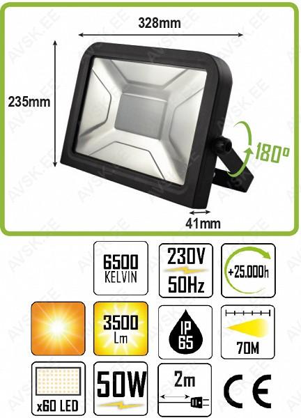 Professionaalsesse kasutusse mõeldud LED prožektor. 50 W. 3500 lm. 6500K. IP65. Valgusvihu pikkus kuni 70 m. Toitekaabel 2 m. 180 kraadi pöörataval jalal. Võimalik juurde osta statiiv koodiga 53506J.