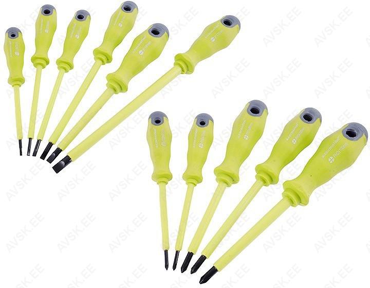 Kõrgepinge isolatsiooniga kruvikeerajad. Kruvikeeraja on valmistatud CrV terasest. väga isoleerivast materjalist. karastatud magnetots.
