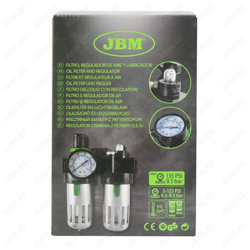 Filter-regulaator + automaatõlitaja suruõhutööriistale. trassiõhule kasutamiseks. Alumiiniumist korpus. polükarbonaadist kogumisanum 150 ml filtreerimiseks ja teine kogumisanum tööriistaõlile. Mõlemad anumad kaitstud alumiiniumkattega. Rõhumanomeetriga. Max töörõhk 9.5 bar. reguleerimisvahemik 0.5-8.5 bar (NB! suruõhutööriistadel soovitame 6.3 bar). 1/4" keermega liideseavad. Seinakinnitus avad.