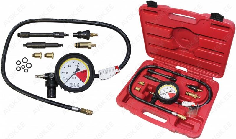 Mootori silindri tiheduse kontrollimise komplekt bensiini- ja diiselmootoritele. Saab kontrollida klappide ja kolvirõngaste pidavust. Lekkivat plokikaane tihendit jne. Adapterid M10x1.0 ja M12x1.25 mootorratta mootoritele. M14x1.25 ja M18x1.5 autode bensiinimootoritele. M24x2 ja M12x1.25 diiselmootoritele.