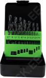 Metallkarbis HSS-R metallipuurid hobi ja kodukasutamiseks. HSS 4241 eriteras. must viimistlus. Komplekt sisaldab mõõte 1.0-1.5-2-2.5-3-3.5-4-4.5-5-5.5-6-6.5-7-7.5-8-8.5-9-9.5-10 mm.