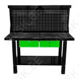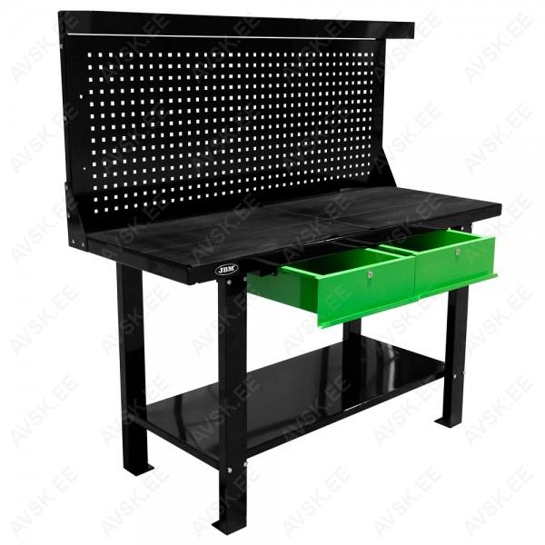 Korralik ja soodsa hinnaga töölaud. millel kaks sahtlit. Perfosein tööriistade riputamiseks. riiul ning karniis valgusti kinnitamiseks. Tugevad nelikantjalad. Lauaplaadi mõõdud 1500x640 mm. üldkõrgus 1550 mm. perfopaneeli kõrgus 610 mm. koos valgustikarniisiga 680 mm. Korralikud plaadi-jala kinnitused. poltliides. Keemia- ja õlikindel pinnavärv.