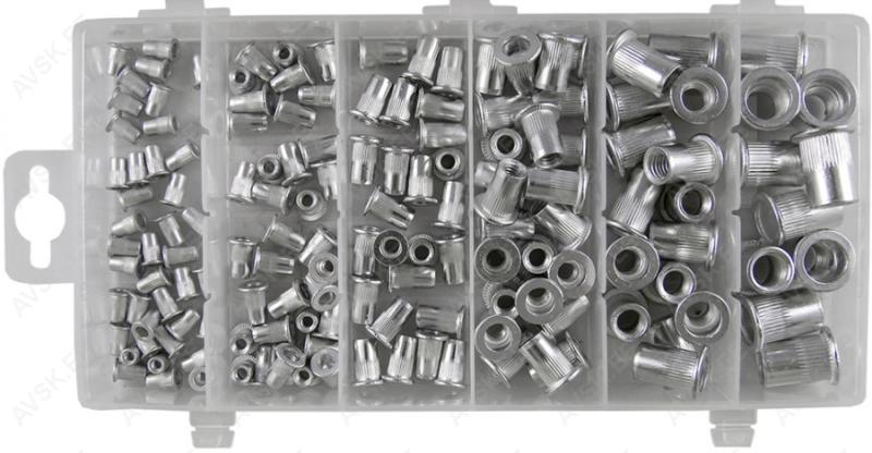 Alumiiniumist keermega hülssneedid. välishülsi pinnal fikseerimisrihveldus. Komplekt sisaldab mõõte M3x9-M4x11-M5x13-M6x15-M8x18-M10x21 mm.
