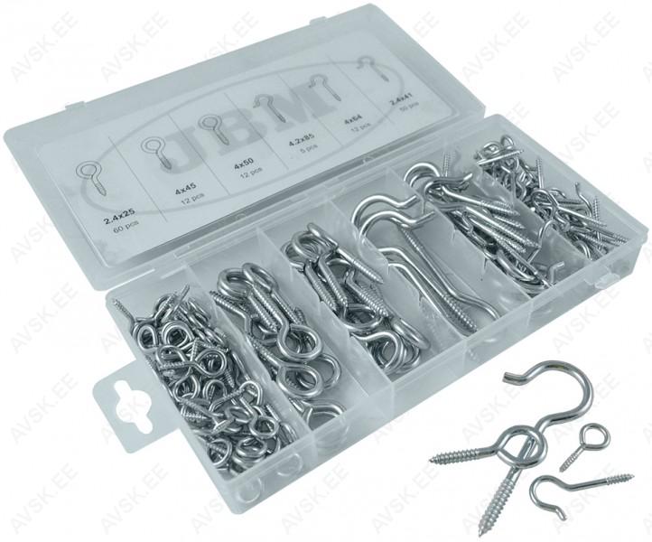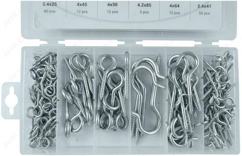 Riputuskonksud ja riputussilmused. Komplektis mõõdud (silmused) 2.4x25-4x45-4x50 mm ja (konksud) 2.4x41-4x64-4.2x85 mm. Galvaaniliselt töödeldud.