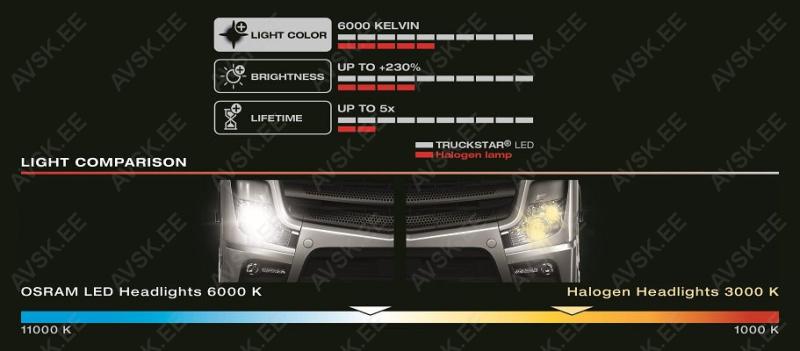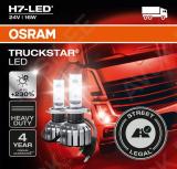 For truck drivers. fleet managers and freight forwarders. For trucks. special vehicles. buses. and towing vehicles. For nearly everyone in the ""heavy duty"" sector and beyond. With the street-legal1) TRUCKSTAR H7-LED for 24V Vehicles you can now upgrade the function of your high- and low beam lights of your vehicle to state-of-the-art LED technology. These LED replacement lamps are suitable as a replacement for conventional H7 lamps and bases. They offer a modern and bright white light with a color temperature of up to 6000 Kelvin and impress with up to 230% more brightness2). while the glare of other road users falls below the permissible maximum values by up to 50%2). In comparison to standard lamps. such as halogen lamps. these LED retrofit lamps consume up to 75% less energy and convince thanks to the LED technology and the especially developed and vibration-resistant design. engineered for the 24V and ""heavy duty"" range. with up to 5 times longer life time3). You can now replace your vehicle lamps with OSRAM´s revolutionary retrofit lamps and experience trend-setting brightness with road approval1) Additionally. OSRAM offers a dedicated guarantee on all TRUCKSTAR LED retrofit lamps4)