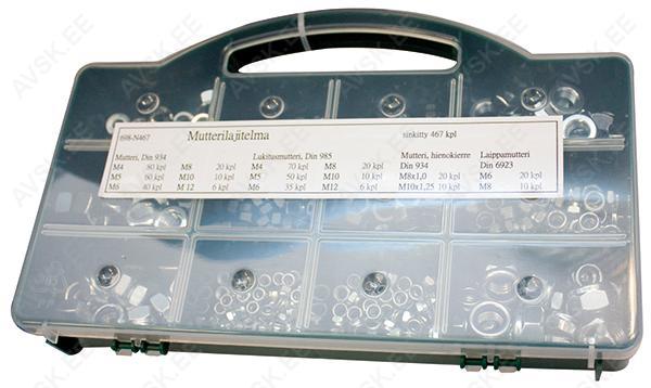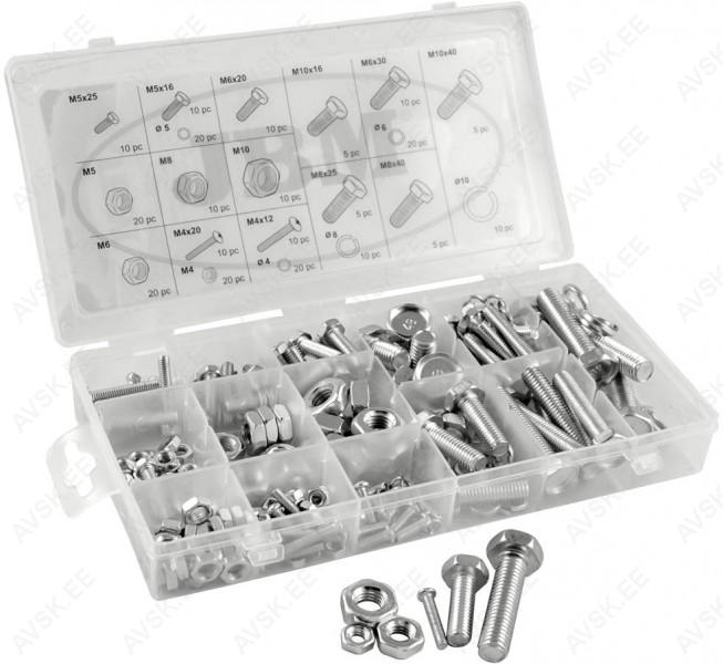 Tsingitud, tugevus 8.8. Komplektis 128 tk. Täiskeere DIN 933: M5x10, M5x20, M6x16, M6x20, M6x30, M6x40, M8x20, M8x30, M8x40, M8x50. Osakeere DIN 931:M6x50, M6x60, M8x60, M8x80 Tsingitud kuuskantmutrid. 467 tk. Kuuskantmutter DIN 934:M4, M5, M6, M8, M10, M12 Lukustusmutter DIN 985:M4, M5, M6, M8, M10, M12 Peenkeermega lukustusmutter DIN 934:M8x1,0, M10x1,25 Äärikuga kuuskantmutrid DIN 6923:M6, M8