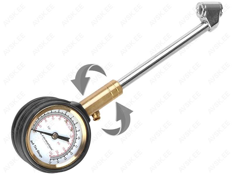 Tugev ja vastupidav metallkorpus. 15 cm pikkune pöörleva peaga toru muudab rõhu mõõtmise raskesti ligipääsetavates rehviventiilides lihtsaks. Mõõtevahemik kuni 15 bar.