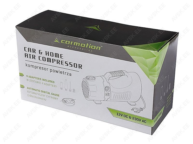 Kompressorit saab kasutada nii 12 V auto sigaretisüütaja pistikupesast kui ka 230 V vahelduvvoolu pistikupesast. Kompressoril on taustvalgustusega ekraan digitaalse manomeetriga – saate määrata rõhu. mille saavutades kompressor pumpamise automaatselt lõpetab. Komplekt sisaldab 4 vahetatavat adapterit. mis võimaldavad kompressorit kasutada Scharderi (AV/DV) ja Presta (SV) ventiilidega. Sobib ideaalselt autorehvide. mootorrattarehvide. jalgrattarehvide. täispuhutavate paatide. madratsite jms pumpamiseks.