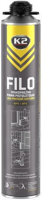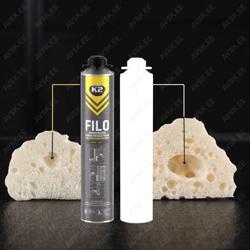 K2 FILO® polüuretaanvaht on madala rõhuga mitmeastmeline montaaživaht. Uuenduslik K2NANOTECH® tehnoloogia tagab kõrge nakkuvuse PVC. alumiiniumi. puidu. polüstüreeni. terase. betooni. krohvi. kiviga jne. Sobib suurepäraselt akende ja uste paigaldamiseks. heliisolatsiooniks ja tühjade avade täitmiseks aknalaudade. treppide. toru- ja kaablisisendite jms paigaldamisel.