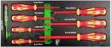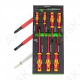 Pehmes PU-paneelis VDE 1000 V kruvikeerajate komplekt. Soovi korral saab kasutada tööriistakäru sahtlis. töölaua sahtlis. tööriistakotis või tööriistakohvris. Foam-paneeli mõõdud 175x380 mm. paksus 30 mm.