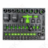 PU-paneelis tööriistade komplekt. mida võib kasutada iseseisvana või siis tööriistakärus või lauasahtlis. Keemia- ja õlikindel materjal. Paneeli mõõdud 400x533 mm.