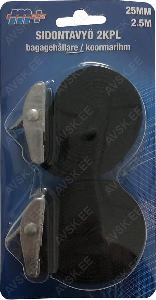 Tugevast nailonkiust valmistatud koorma kinnitamise rihm. Metallist lukustiga. Sobib kergemate ja väiksemate asjade kinnitamiseks. Suusad. kelgud. rattad jne. Pakis 2 tk.