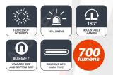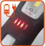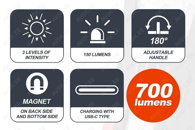 Li-Ion COB LED võimas töölamp Triumf MAX1. Uuemat tüüpi USB-C pesa kaudu laadimine (DV 5V. 1A). Lambi otsal on täpne kohtvalgusti 150 lm. põlemisaeg 7 tundi. Võimas külgvalgusti. 3 asendiga: 700 lm. põlemisaeg 2 tundi . 350 lm. põlemisaeg 4 tundi ja 175 lm. põlemisaeg 8 tundi. Aku Li-Ion 3.7 V. 2600 mAh. 9.62 Wh. laadimisaeg 3.5 tundi. Väga tugev magnet korpuse all ja taga. 180 kraadi nurga ulatuses reguleeritav/fikseeritav korpus. 2 riputuskonksu. 360° pööratavad. Kaitseklass: IP65. IK07. Löögikindlast plastist korpus. Aku laetuse indikaatoriga. USB laadija kaabel sisaldub komplektis.