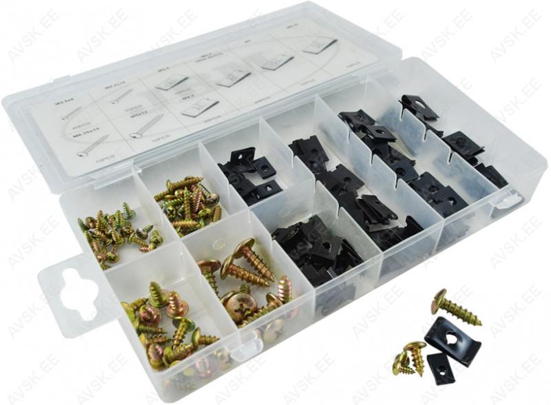 Komplekt sisaldab enamlevinud autonduse plekikruvisid ja nende U-mutreid. Sisaldab mõõdud 2-3-3.5-4.2-5-6.35 mm.