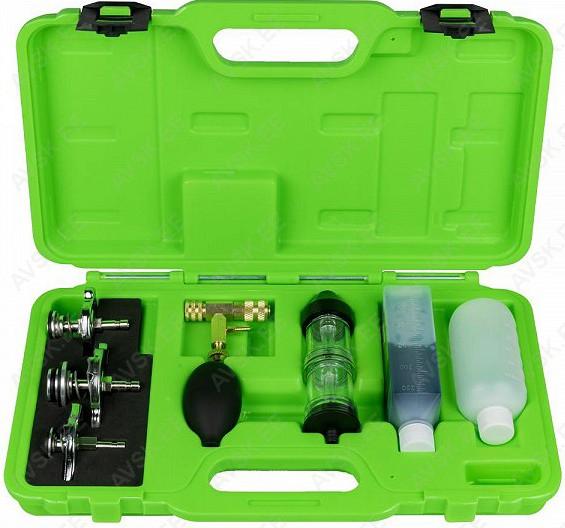 Suurepärane komplekt autoremondi töökojale. mille abil saab kokku hoida aega. Saab tuvastada plokikaane. plokikaane tihendi -> jahutussüsteemi lekkeid läbi CO2. Kaasas aine. korgid. pump jne. Kui CO2 pääseb jahutussüsteemi. siis muutub kapillaartorus teises kambris olev aine kollaseks või rohekaks. Tugevas plastkohvris.