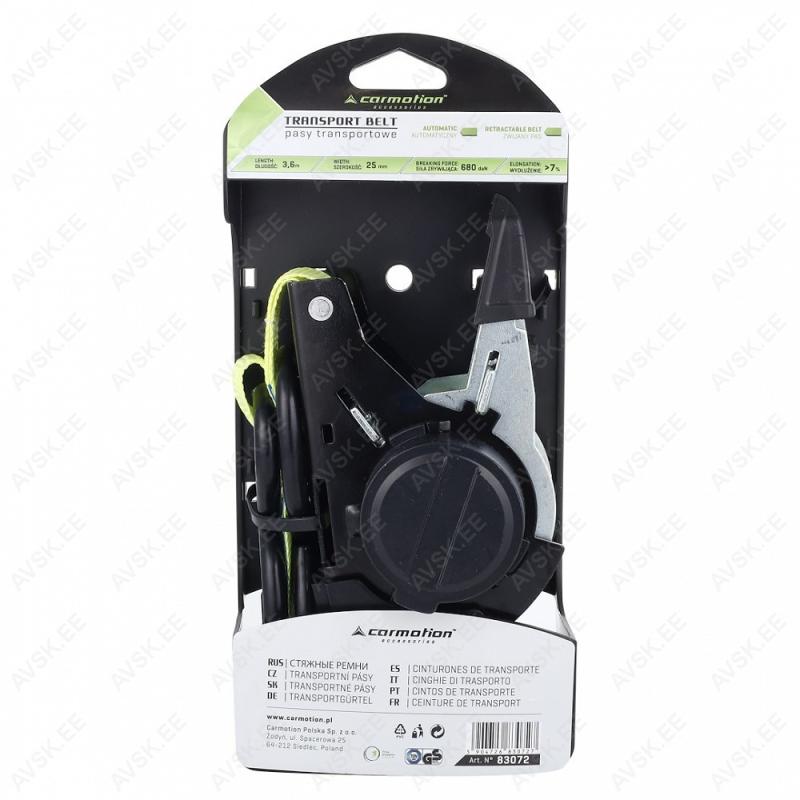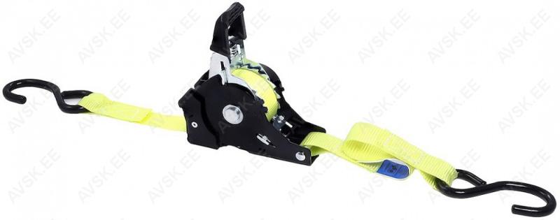 Integreeritud automaatse tagasikerimisega rihm koormate kinnitamiseks transportimisel. Tagasikerimismehhanism võimaldab rihma kiiret ja automaatset tagasikerimist ilma käsitsi voltimise vajaduseta. Suurepärane lahendus. kus koormaid tuleb sagedaselt kinnitada ja vabastada.