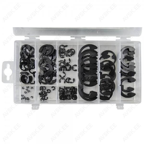 E-clip lukustus rõngasseibid. Enamlevinud mõõdud meetermõõt ja tollmõõt. Plastkarbis. 1.5 mm - 1/16" (15 tk). 3 mm - 1/8" (15 tk). 5 mm- 3/16" (20 tk). 6 mm - 1/4" (25 tk). 9 mm - 3/8" (25 tk). 12 mm - 1/2" (20 tk). 15 mm - 5/8" (10 tk). 19 mm - 3/4" (10 tk). 22 mm - 7/8" (10 tk).