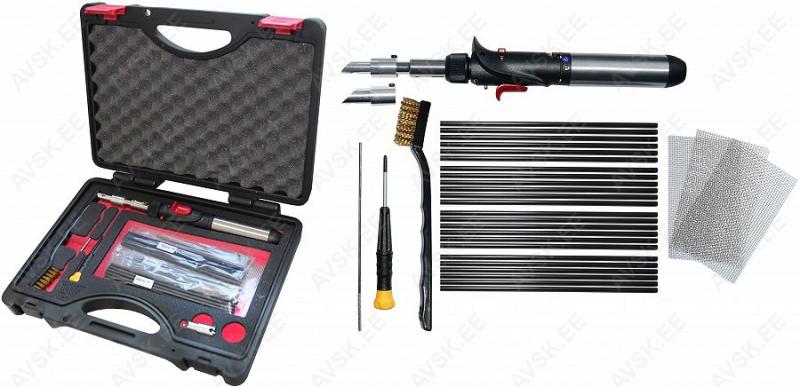 Põletigaasilt töötav plastikeevituse seade. Reguleeritav kuumus. Komplektis kaks suurust keevitusotsikut. Piezo-süütemehhanismiga. Kaasas ka plast elektroodid ( PE. PP. PS. ABS ) ja metallist tugevdusvõrgud. Plastkohvris.