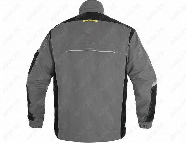 Tööjakk STRECH tootesarjast. 98% puuvill. 2% elastaan. 250 g/m2 (kanga tihedus) on hingavast. venivast. kergest ja mugavast kangast. mis annab kasutajale palju parema liikumisvabaduse. Kulumiskindluse suurendamiseks on enim kuluvatel kohtadel nagu õlaosadel. küünarnukkidel. varruka- ja taskuäärtel kasutatud tugevat polüesterkangast 600D. Krae sees pehme materjal. 5 funktsionaalset taskut. Ees tõmblukk. mis kaetud trukk-kinnituse esiliistuga. Randmeosad ja alt äär reguleeritavad trukk-kinnitusega. Selja alaosa pikendatud. Dekoratiivsed helkurribad varrukatel ja seljal. CE (EU) 2016/425