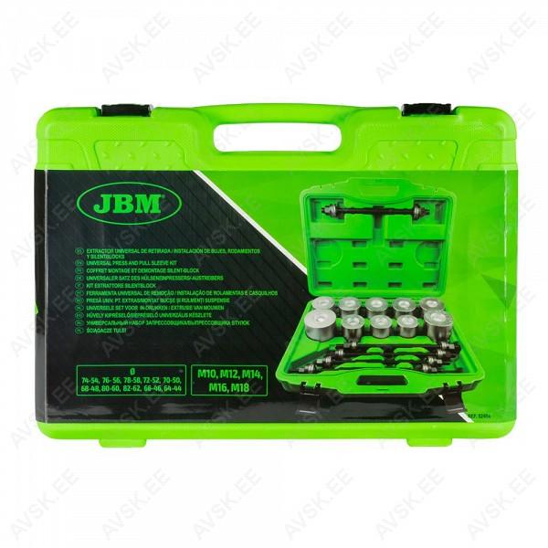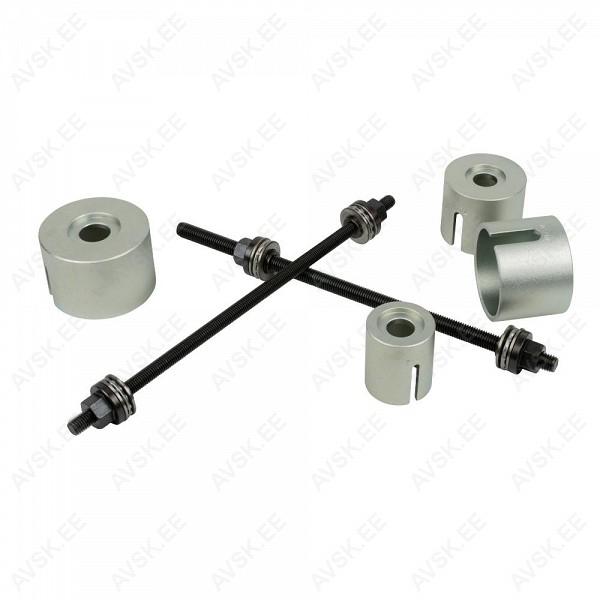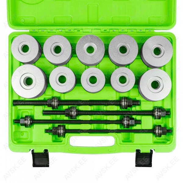 Universaalne pukside - rattalaagrite pressimise komplekt. plastkohvris. Sobib sõiduautodele. pakiautodele. põllumajandustehnikale jne. Komplektis jõukruvid (enne kasutamist määrida) M10. M12. M14. M16 ja M18. Mõõdud: 74/54-76/56-78/58-72/52-70/50-68/48-80/60-82/62-66/46-64/44 mm.