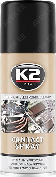 K2 Contact Spray on elektriosade puhastamiseks ja kaitsmiseks mõeldud rasvaärastus- ja kaitseaine. See eemaldab oksiide. sulfiide ja muud mustust ning omab tungivaid ja lahustavaid omadusi. Ei juhi elektrit. kaitseb niiskuse. korrosiooni ja rooste eest. Sobib kasutamiseks sellistele elementidele nagu pistikud. kontaktid. ühendused. juhtmed. lülitid. lambipirnid. kaitsmed jne. K2 Contacti kasutamine taastab madala kontaktitakistuse ja vähendab pingelangusi. Ideaalne hoolduseks ilma lahtivõtmiseta. Kiiresti kuivav.