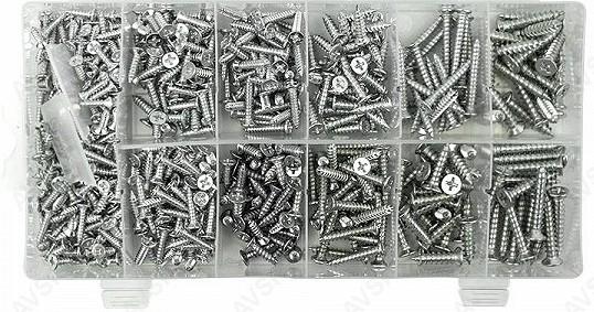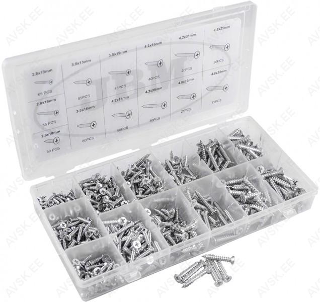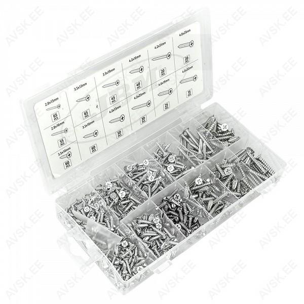 Faasitud peaga kruvide komplekt. Plastkarbis. Mõõdud 2.8X13 mm - 65 tk. 2.8X16 mm - 55 tk. 3.5X10 mm - 60 tk. 3.5x13 mm - 65 tk. 3.5x16 mm - 60 tk. 3.5x19 mm - 45 tk. 4.2x13 mm - 50 tk. 4.2x16 mm - 40 tk. 4.2x25 mm - 30 tk. 4.2x31 mm - 20 tk. 4.8x19 mm - 25 tk. 4.8x25 mm - 20 tk. 4.8x32 mm - 15 tk.