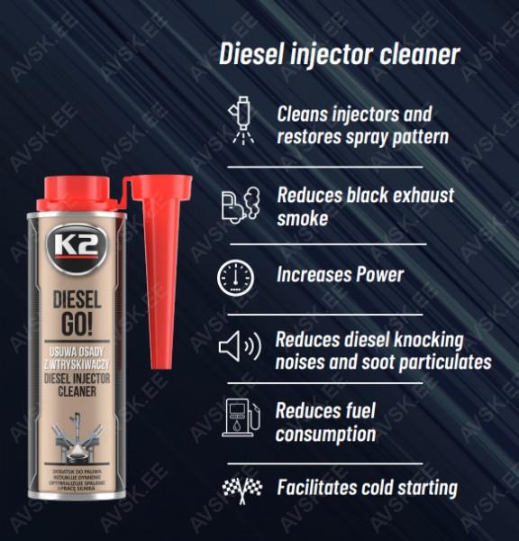 K2 DIESE GO! on professionaalne kütuselisand. mis on spetsiaalselt ette nähtud kõrgsurvepihustite ja common rail diiselmootorite jaoks. Diislikütusele lisatuna lahustab kõrgsurvepumpades. sissepritsesiinides japihustites tekkinud setteid. Selle tulemusena puhastab see pihustid ja pihustiotsikud ning parandab pihustite tööd. K2 DIESELGO! on suurepäraste puhastus- ja määrimisomadustega. tänu millele pikendab kogu toitesüsteemi eluiga.