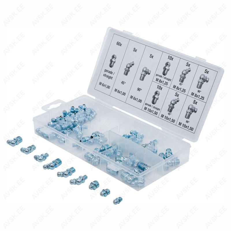 Nelikandid: -8,7 / 9,5 / 10,5 / 11,5 / 13 mm. Kahanevad: -6,8-8,7 / 10,5-13 / 15,2-18 / 16,5-19 mm. Lapikkruvits 5,5x18 mm sirged, 45° ja 90° nurga all olevad määrdeniplid Komplektis: 20 määrdenipplit 1/4" - 28 NTP, sirged5 määrdenipplit 1/4" - 28 NTP, 45°5 määrdenipplit 1/4" - 28 NTP, 90°10 määrdenipplit 1/8" - 27 NTP, sirge5 määrdenipplit 1/8" - 27 NTP, 45°5 määrdenipplit 1/8" - 27 NTP, 90°10 määrdenipplit M6 x 1,0 mm, sirged5 määrdenipplit M8 x 1,0 mm, sirge5 määrdenipplit M10 x 1,0 mm, sirgeBrutokaal 396 g Materja... sirged, 45° ja 90° nurga all olevad määrdeniplid Komplektis: 60 määrdenipplit M6 x 1,00, sirged5 määrdenipplit M6 x 1,00, 45°5 määrdenipplit M6 x 1,00, 90°10 määrdenipplit M8 x 1,25, sirge5 määrdenipplit M8 x 1,25, 45°5 määrdenipplit M8 x 1,25, 90°10 määrdenipplit M10 x 1,50, sirge5 määrdenipplit M10 x 1,50, 45°5 määrdenipplit M10 x 1,50, 90°Brutokaal 456 g Materjal Süsinikteras (A3) Pinnaviimistl...
