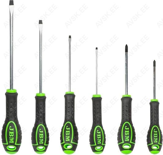 Korralikud kruvikeerajad "J-Grip" komposiit keeramispeaga. Valmistatud õli- ja keemiakindlast komposiitmaterjalist ning CrV eriterasest. Kruvikeeraja keeramisots fosfaaditud pinnatöötlusega. Pappkarbis.