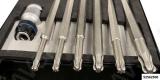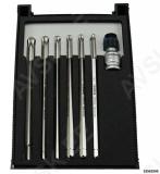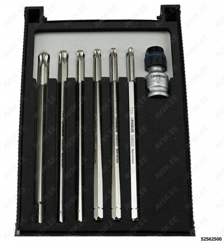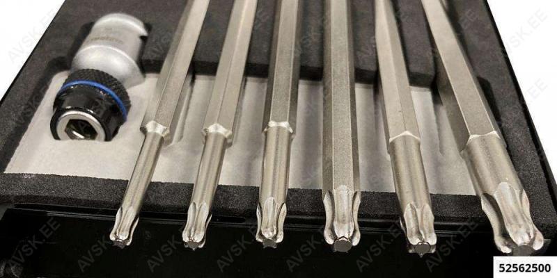 Spetsiaalsete pikkade TORX otsikute komplekt magnetiga ja kuulotsaga. Võimaldab töötada raskesti ligipääsetavates kohtades. kuulots võimaldab keerata ka nurga all. tugev magnet hoiab poldi paigal. võimalik polti paigaldada ka ülevalt alla kitsas kohas. kuhu muidu ei mahu polti paigaldama. Väljakeeratud polt jääb magneti külge. mis välistab poldi kukkumise raskesti ligipääsetavasse kohta. Võtme pikkus 123.5 mm. Keeramisadapter 3/8" tapiavaga. Torx: T20/T25/T27/T30/T40/T45.