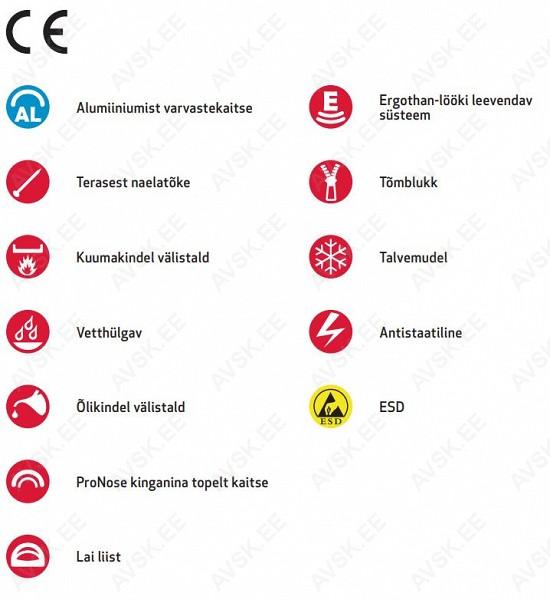 Aastaringne kasutus karmis keskkonnas. laia liistuga. kuuma- ja õlikindel välistald. antistaatilised omadused. kinnine saapa keel. polsterdatud saapasäär. hingav sisetald. tehnilisest fliisist vooder. tõmbeaasad. tõmblukk. vetthülgav. kahekordsed lööki leevendavad alad. vastab standardile IEC 61340-5-1 (ESD). EN ISO 20345:2011. S3 SRC CI HRO HI.