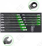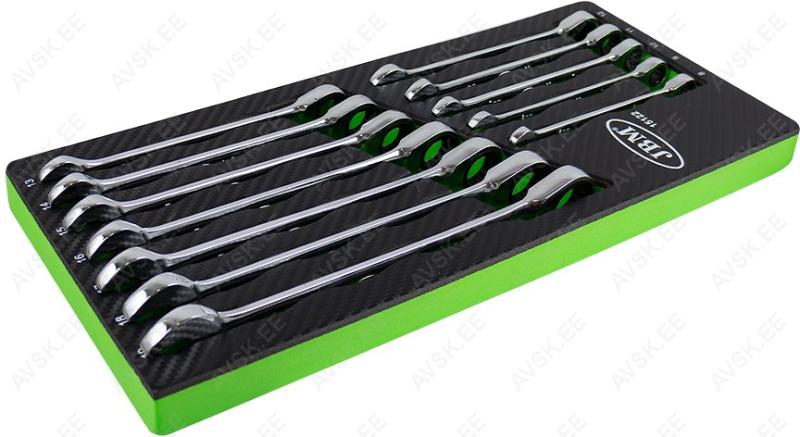 72H tirrmehhanismiga. poleeritud pinnatöötlusega silmus-lehtvõtmete komplekt. Pehmes. carbon-kattega foam-paneelis. soovi korral saab kasutada tööriistakäru sahtlis või tööriistakotis. tööriistakohvris. Foam-paneeli mõõdud 175x380 mm. paksus 30 mm.