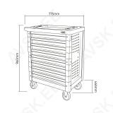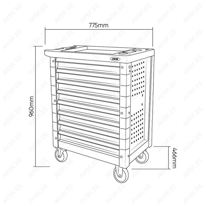 Tugev ja vastupidav "post & beam" kandevkonstruktsioon. 9 sahtlit mahutab kõik vajalikud tööriistad. Perfoseinad lisatarvikute kinnitamiseks. Laagritel sahtlid. Õli- ja keemiakindel värvkate. Kummikattega rattad. millest 2 pööravad. Plastist pealisosa. Kärusse mahuvad kõik JBM PU-paneelid tööriistadega. mida võimalik osta eraldi - küsi lisainfot (või otsi märksõnaga PU-paneelis). Sahtli sisemõõdud: laius 533 mm. sügavus 400 mm. kõrgus 65 mm. Käru kõrgus 960 mm. laius 775 mm. sügavus 466 mm.