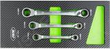 Pehmes PU-paneelis 4-in-1 tirrmehhanismiga. reeversiga silmus-silmusvõtmed. Ühel võtmel on 4 mõõtu. Soovi korral saab kasutada tööriistakäru sahtlis. töölaua sahtlis. tööriistakotis või tööriistakohvris. Foam-paneeli mõõdud 175x380 mm. paksus 30 mm.