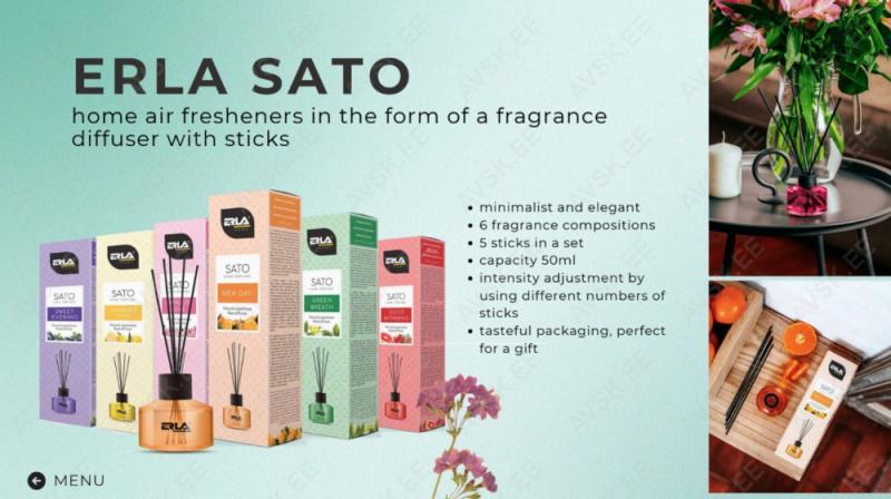 Erla Sato on stiilne õhuvärskendaja pulkadega lõhna hajuti kujul. Elegantne ja praktiline. Tänu sellele saate hõlpsalt värskendada ja kaunistada ruumi. kodus. kontoris ja kus iganes soovite. Ainulaadsed aroomikompositsioonid muudavad sisekliimat ja täidavad selle lõhnaga. mis kestab kuni 6 nädalat. Erla Sato õhuvärskendajat saate edukalt kasutada ka soovimatute lõhnade maskeerimiseks. Lõhnaga küllastunud pulgad eraldavad aroomi järk-järgult. Erla Sato lõhna intensiivsust saab pulkade hulgaga reguleerida. Mida rohkem pulki on essentsi kastetud. seda tugevam on lõhn. Suurtes ruumides saab SATO õhuvärskendajaid omavahel kombineerida. et luua ainulaadseid aroomikompositsioone.