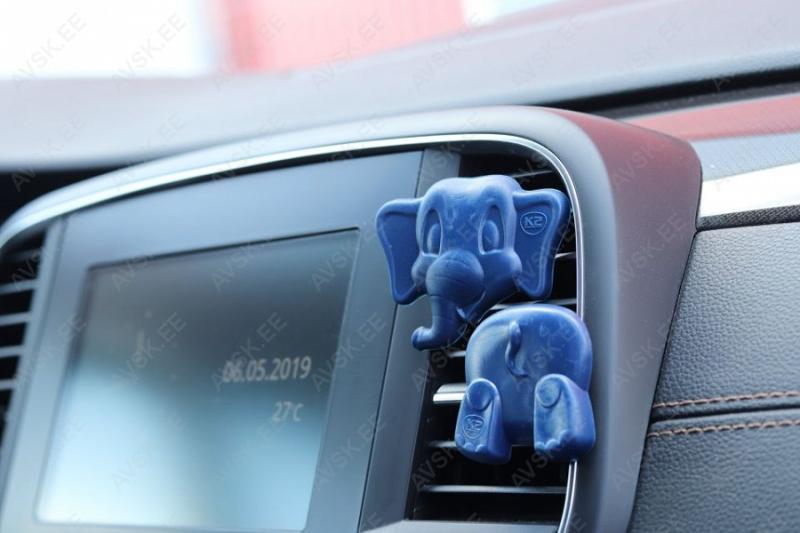 K2 ARLO NEW CAR on polümeerelevandi kujul olev autolõhn mis toob teie autosse rõõmsa atmosfääri ja kauakestva atraktiivse lõhna. Õhuvärskendaja koosneb kahest elemendist. mis on varustatud klambritega ja mis paigaldatakse õhuavadesse. Saate selle paigaldada nii. nagu soovite. Teie käsutuses on elevandi pea ja selg. Kuhu ja kuidas need paigutada. sõltub täielikult teie loovusest. Õhuvärskendajas kasutatav polümeermaterjal ei määri käsi. see on täiesti ohutu autos kasutatavale plastikule ja nahale.
