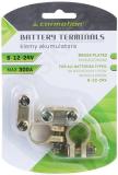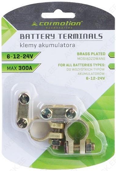 Sõiduauto akuklemmide komplekt. Galvaaniliselt töödeldud. Sobib väikse ja keskmise suurusega mootoriga autodele. Praktiline ja vastupidav poltkinnitus. 6 V. 12 V ja 24 V elektrisüsteemidele.