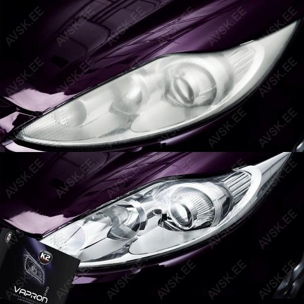 K2 Vapron on revolutsiooniline meetod kahjustatud autotule klaaside taastamiseks. Komplekti töö põhineb läbipaistva polükarbonaatkihi taastamisel (plast. mida kasutatakse esilaternakatete klaaside valmistamisel). kasutades vedelat polükarbonaatkatet. et taastada tuleklaasi struktuur. Sobib suurepäraselt kahjustatud (tuhmide. kollakate) esitulede taastamiseks. olenemata auto vanusest ja laternate kahjustuste astmest. Esilaternate regenereerimine K2 Vapron komplektiga on kõige tõhusam ja ohutum meetod esilaterna pinna uuendamiseks. K2 Vapron komplekt eemaldab kõik kriimustused. värvimuutused ja hägususe. Vedel polükarbonaat kuumutatakse spetsiaalses "teekannus" (tass) ja seejärel kantakse selle aurud kahjustatud pinnale. Sel viisil taastatud lambid saavad tagasi oma esialgse välimuse. Saadaval ka K2 Vapron täidis 600 ml (koodiga K2D7930). Ainult professionaalseks kasutamiseks. Komplekt ei sobi klaasist esitulede regenereerimiseks.