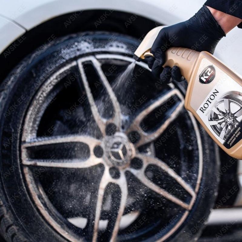 K2 ROTON eemaldab suurepäraselt kogu tõrksa mustuse. sealhulgas piduriklotside ladestused ja teemustuse. mille tulemuseks on peale kantud vedeliku punane värv. Sellega velgede pesemine on kiire ja tõhus ning ei nõua pingutust. Mustus eemaldatakse ilma puhastatava pinna kriimustamise ohuta. Sobib kasutamiseks igat tüüpi velgedel – teras. alumiinium. kroom ja lakitud.